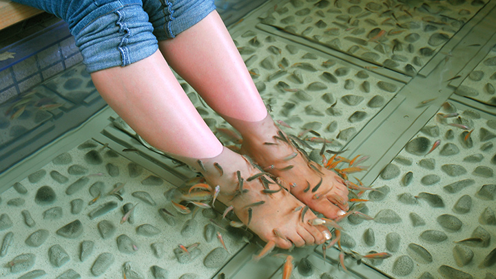 古い角質を食べる不思議な小魚達が泳ぐドクター・キッスフィッシュ。足湯で皮膚の新陳代謝を促進!