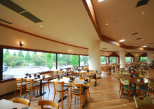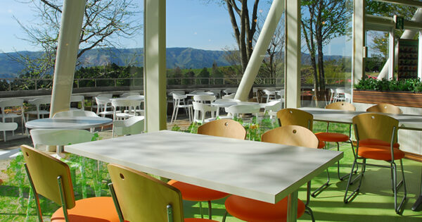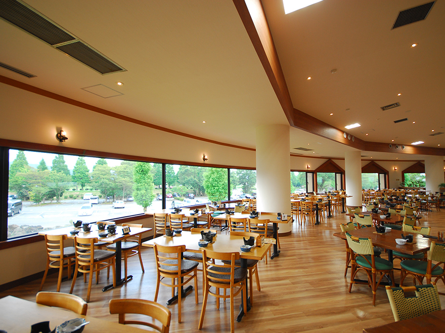 一度に300人以上入ることができる広い店内で、ゆっくりと食事を楽しむことができます。大きなガラス窓からは、阿蘇の美しい景色が望めます。食事を囲めば、心も和みます。