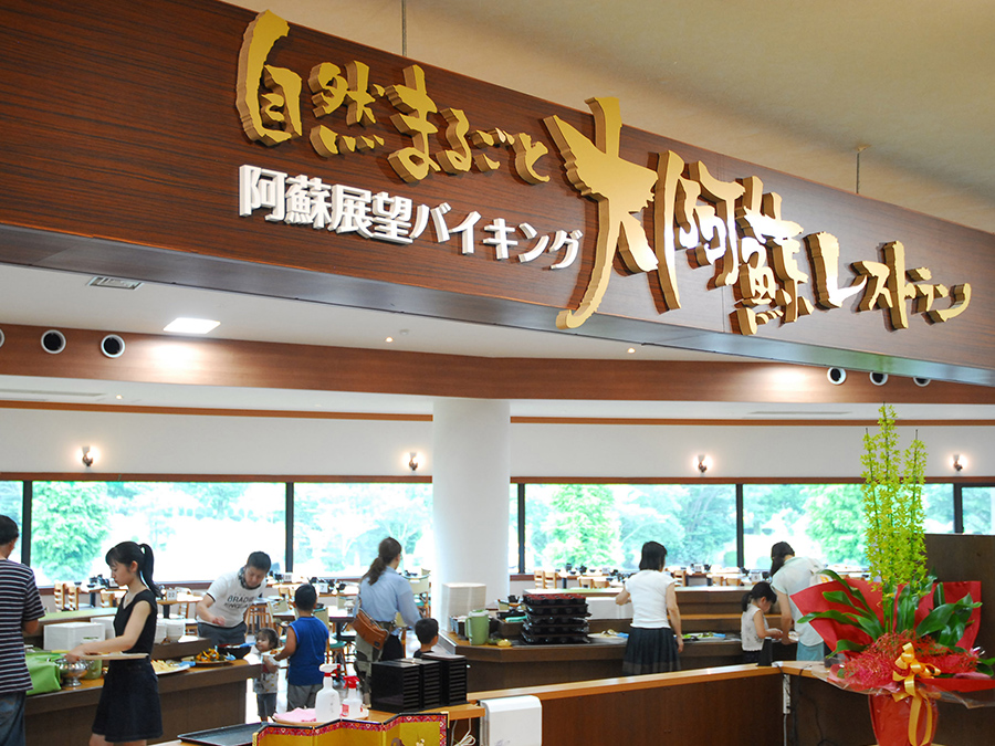 大自然の恵みを美味しく味わう、阿蘇の健康バイキング。店内の大きなガラス窓から一望できる、四季おりおりの美しい阿蘇の山々。開放感あふれる空間で、ゆっくりと美味しいバイキング(食べ放題)をお楽しみください。