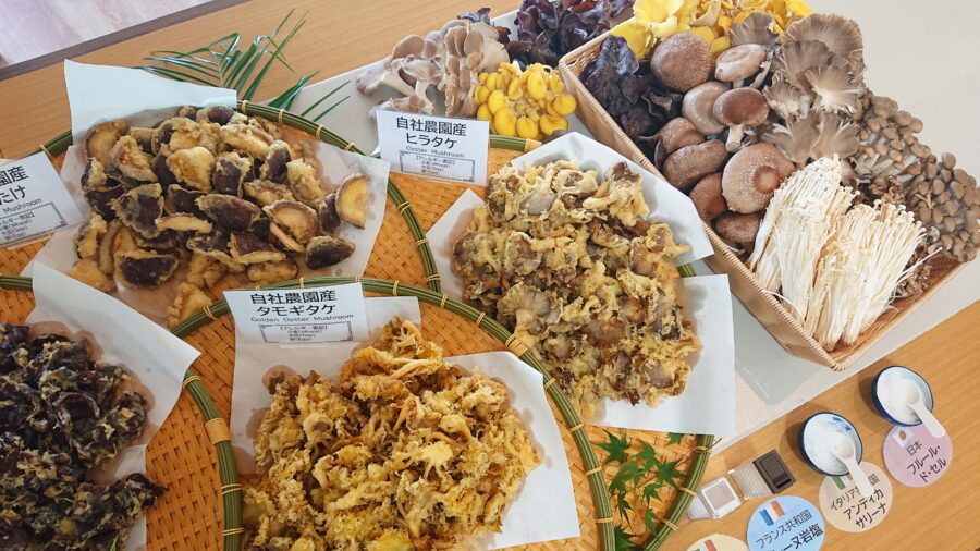 2024年春より、自社栽培の採れたて新鮮サラダ、きのこ鍋、きのこ天ぷら、発酵食品・発酵調味料を使用した料理の提供も行っております。