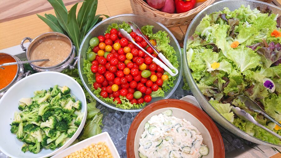 栄養素・カロリーを明示した、採れたて野菜の健康バイキング