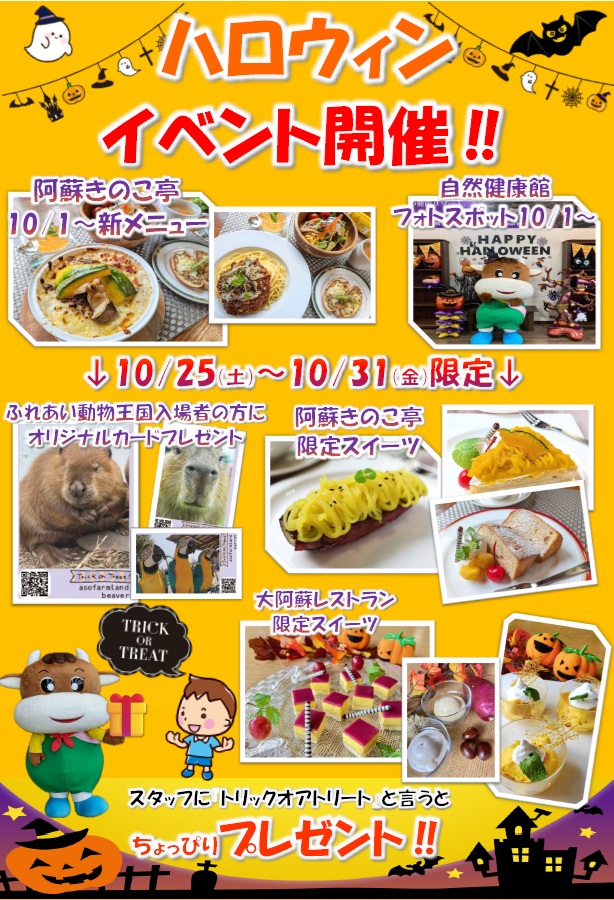 10月1日から31日まで、「自然健康館」前にはハロウィン仕様のフォトスポットが登場!かぼちゃやおばけをモチーフにしたデコレーションは、お子さまはもちろん大人にも人気です。家族や友達と一緒に、阿蘇の自然を背景に“とっておきの一枚”を撮影しましょう。SNSに投稿すれば、秋の思い出がさらに華やかになりますよ♪