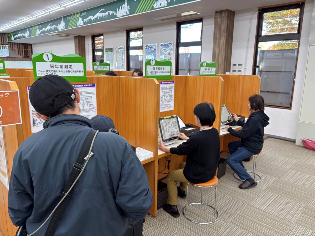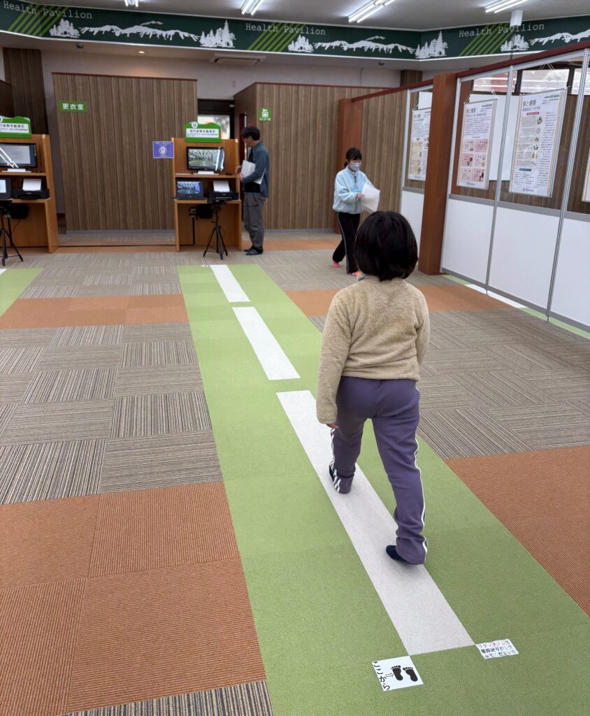 各施設や紅葉の林を訪ね歩きながら、「健康パビリオンⅡ」での各種測定体験は盛り上がりました。全員が「歩行姿勢年齢測定」を体験し、自分の歩き方のバランスや傾き、揺れなどについて深い学びを得ることができました。参加者のひとりは「悪いクセが分かってよかった。今後、意識してみます。」と感想を語っていました。「大阿蘇レストラン」の料理人が作った"元気弁当"も好評でした。