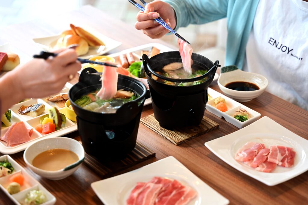 今回の健康しゃぶしゃぶの魅力は、好きな食材を自由に選んで楽しめるスタイル。テーブルには一人用の鍋が用意され、あつあつのスープでお肉や野菜をさっとしゃぶしゃぶ。自分のペースで食べられるので、ゆったりとした朝食時間を楽しめます。用意されている食材は、栄養バランスを意識したラインナップ。体にやさしく、朝から元気をチャージできるメニューになっています。