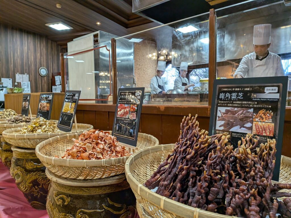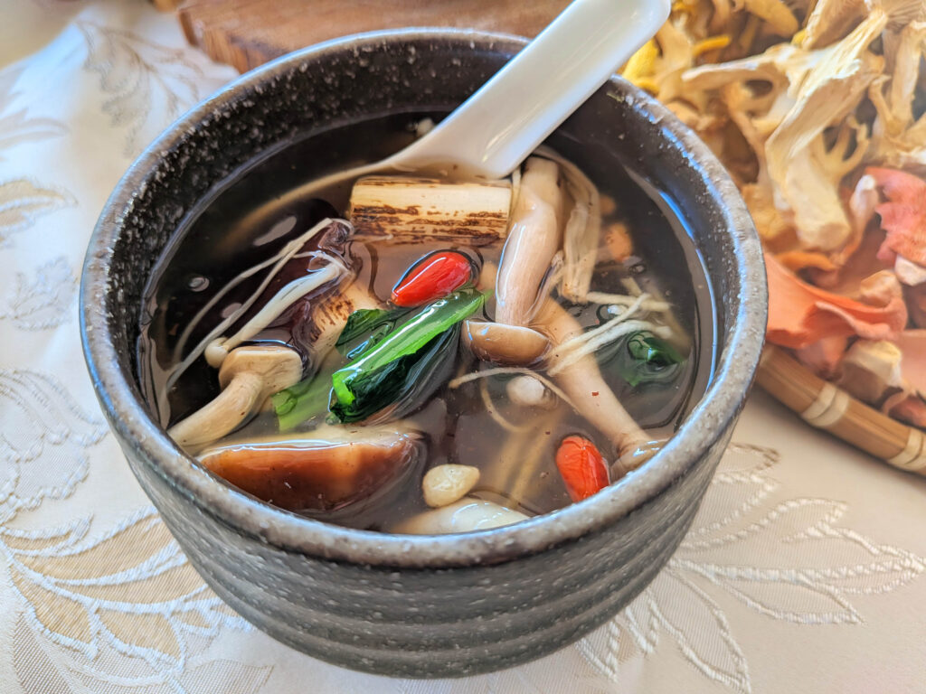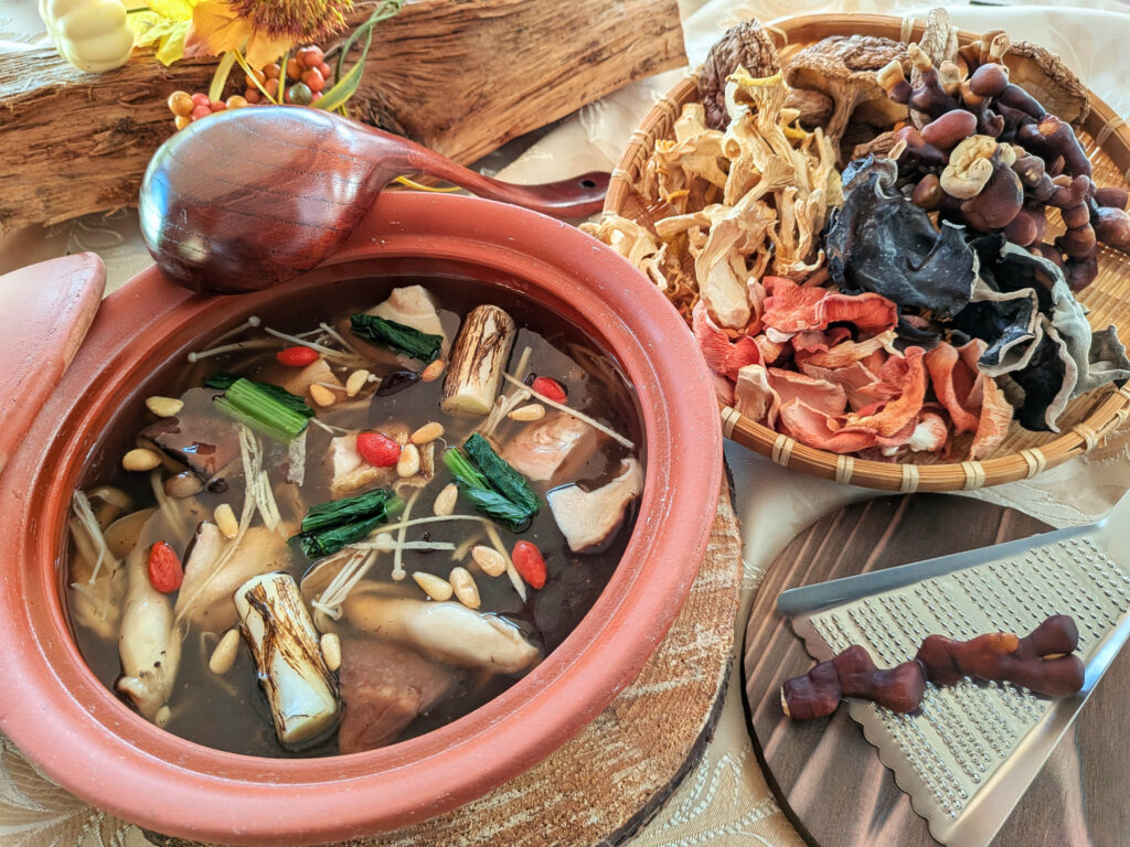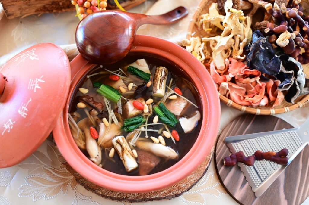 「阿蘇薬膳スープ」は当社の料理人が「身体の中から元気になる」をテーマに、自社農園より厳選した11種類ものきのこを原材料に新たな薬膳料理を創作。調理方法にもこだわりました。鰹や昆布、自社農園産の乾燥きのこ(椎茸・南ヒラタケ・トキイロヒラタケ・タモギタケなど)で出汁を取り、チキンエキスやスパイスを加えたスープに、生のきのこ5種や古くから珍重されてきた鹿角 霊芝(ろっかくれいし)、鶏肉、生姜、ネギ、クコの実、松の実などを加えて仕上げています。