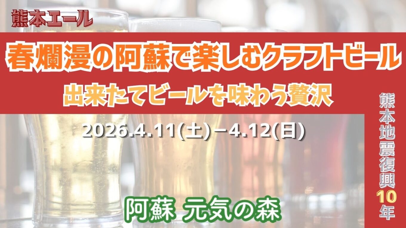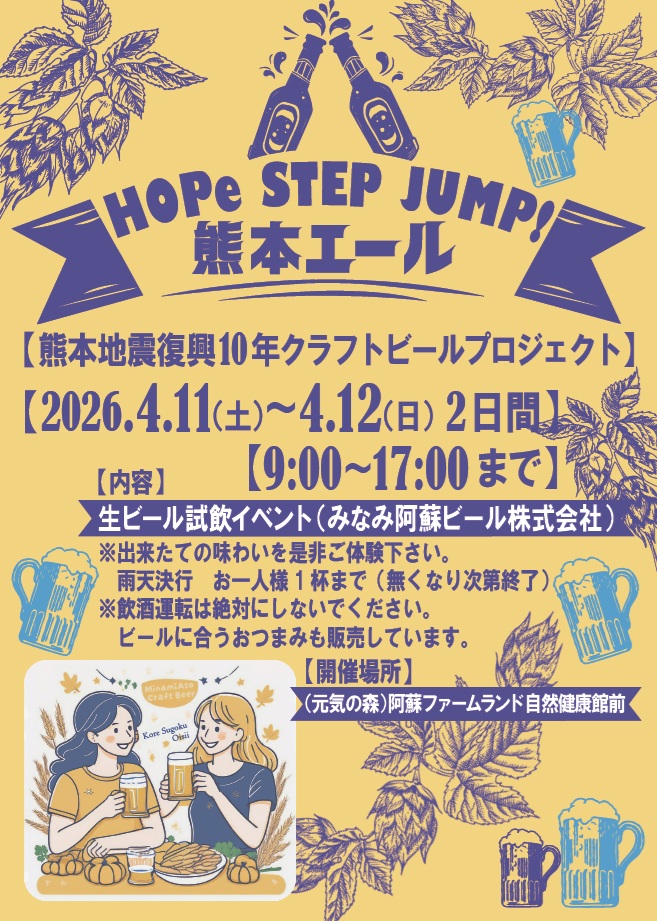 熊本の自然に囲まれた阿蘇ファームランド内、日帰りエリア「阿蘇元気の森」で、心温まるイベント「HOPe STEP JUMP! 熊本エール」が開催されます。これは熊本地震から10年という節目に企画されたクラフトビールプロジェクトで、地域の復興への想いがぎゅっと詰まった催しです。気軽に立ち寄れるロケーションなので、観光の合間にもぴったりです。開催日時:2026年4月11日(土)・12日(日)の2日間 9:00〜17:00まで開催場所:阿蘇ファームランド/阿蘇元気の森の自然健康館前