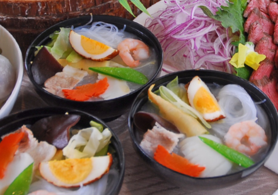 「太平燕(タイピーエン)」は、春雨を使ったあっさりスープ。鶏ガラスープの旨味に野菜や海の幸がたっぷり入り、体にもやさしい一品です。※春雨とは、でんぷんから作られる透明な麺のことです。
