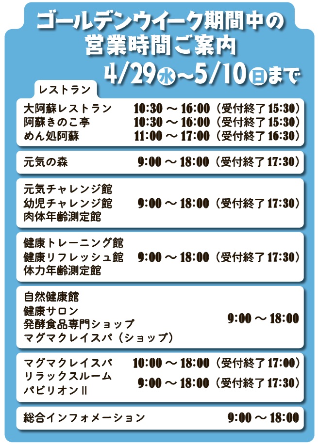 2026年のゴールデンウィーク期間(4月29日~5月10日)は、阿蘇元気の森の各施設が以下の時間で営業します。