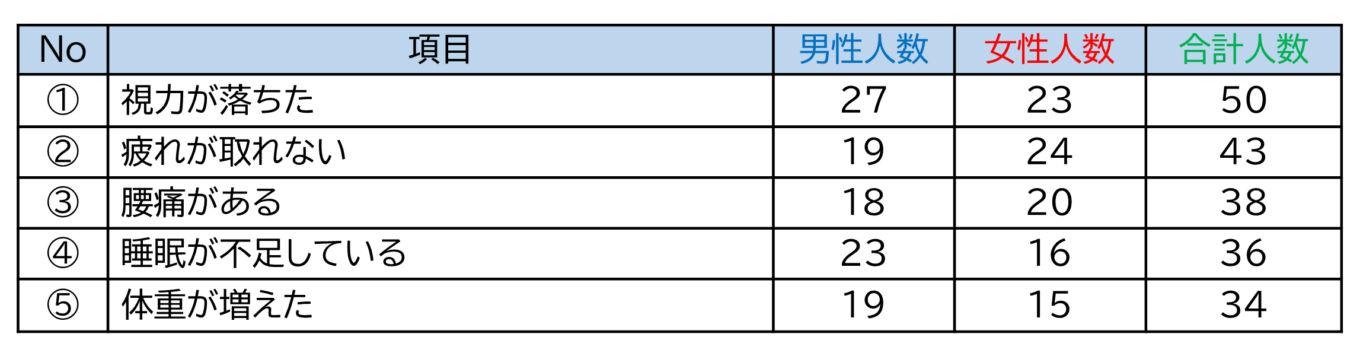 また、視力が落ちたと感じる人が多かったのは意外でした。