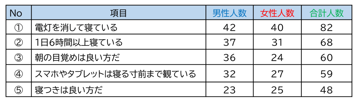 今回のアンケートで、6時間以上寝ている人が多い割には、「睡眠不足」と「疲れが取れない」との回答が多く、その原因の1部と考えられるのは、「朝食を摂っていない」「21時以降の食事」「スマホ等を寝る寸前まで観ている」の3点。