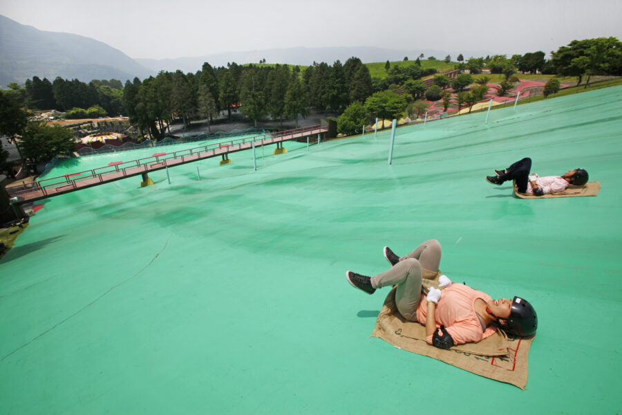 元気の森内にある全長80m日本最大級の滑り台。ビッグな斜面を麻袋に座って一気に滑降すれば圧倒的な開放感と爽快感が楽しめます。