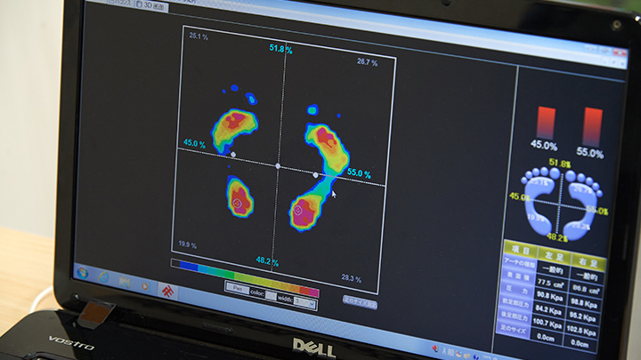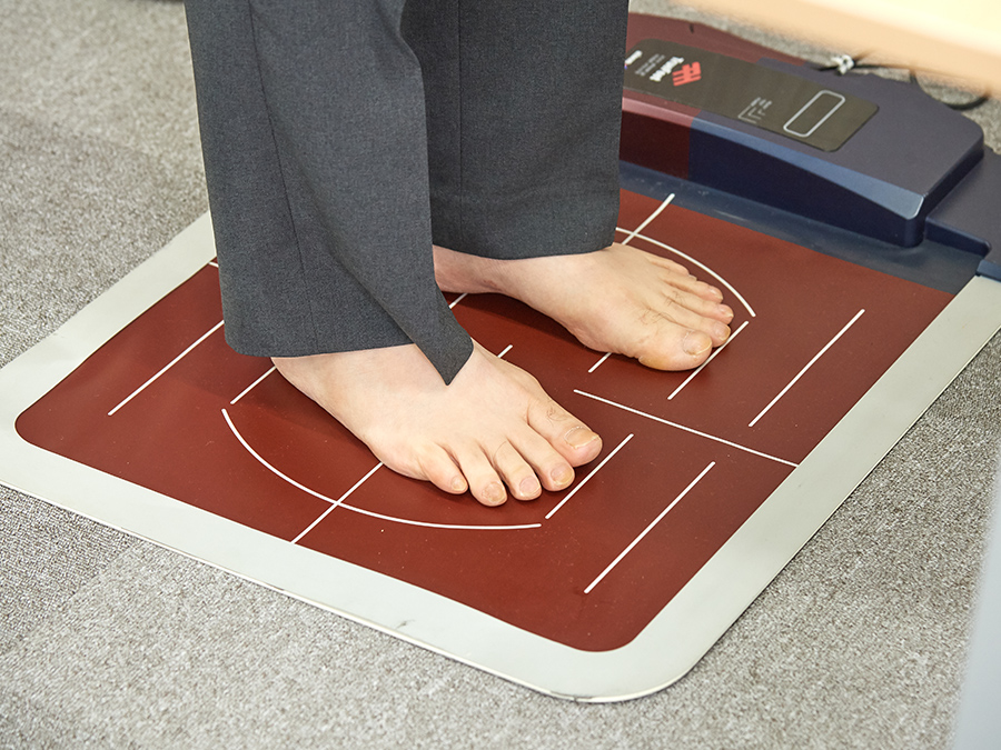 静止立位時と歩行時の足底圧測定とバランス測定を短時間で行えます。足裏の圧力分布から足裏の健康度や身体のバランスをチェックします。