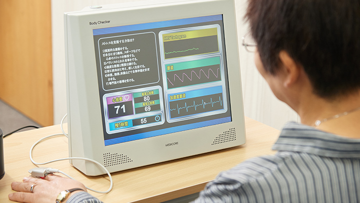 左手指先で血管の老化度とストレス度を同時測定!自律神経の活性度および交感神経・副交感神経の均衡状態を 分析し、ストレスへの対処能力などストレス度合いを判定します。