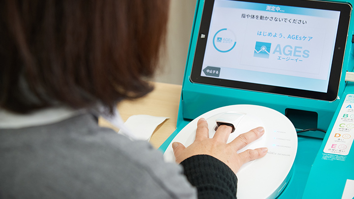 生活習慣チェックの新指標!!不適切な食生活や生活習慣、運動不足などにより体内で増加、蓄積されたAGEs(最終糖化産物=老化物質)の量を評価します。