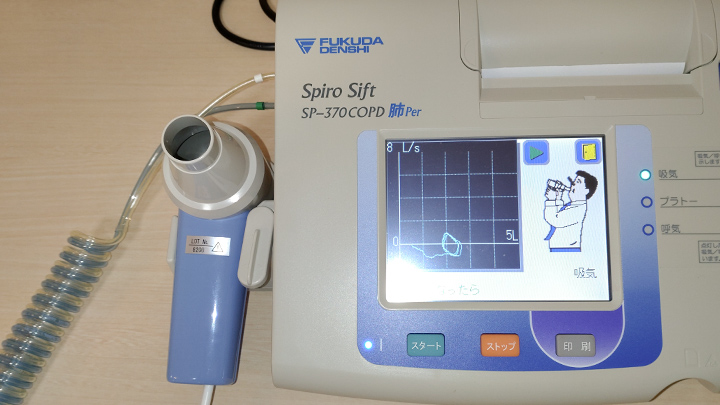 肺年齢・肺活量・努力性肺活量・1秒量(努力性肺活量の内、最初の1秒間に吐き出された量)・1秒率・ピークロー(努力肺活量での最大の呼吸流速)・COPD評価