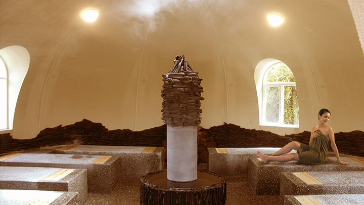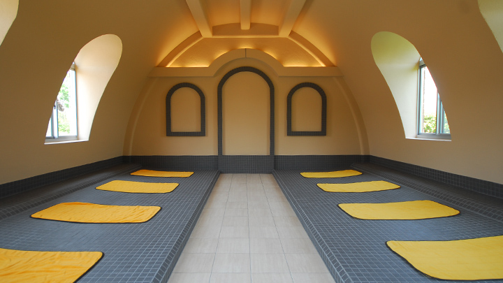 天然ミネラルと鉄分を多く含んだリモナイトをプレート状にして寝台の下に敷き詰めています。リモナイトは、保湿効果に優れ、身体を芯から温める働きがあります。心地よい温度に温められた特殊な石の上に横になるだけで気持ちよく発汗し、体内の余分な老廃物を排出、新陳代謝の活性化による血行促進効果で身体を健康に戻します。