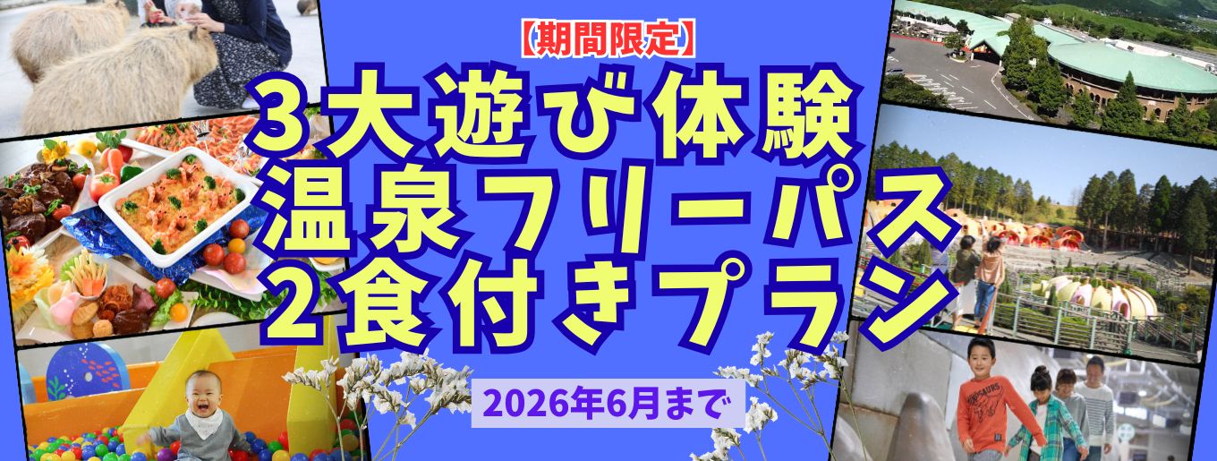 1泊2食+火山温泉フリーパス券付き+3大遊び特典つき