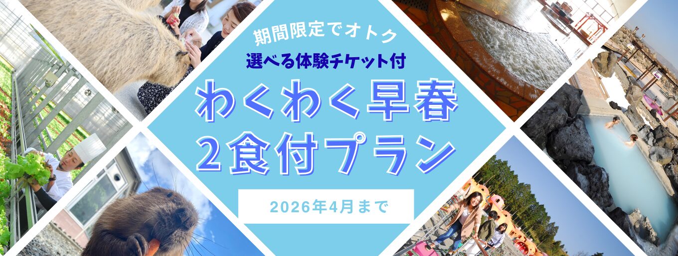 早春限定!阿蘇健康火山温泉のフリーパス付きで、滞在中は好きなだけ温泉三昧。さらに「元気の森」「ふれあい動物王国」「手作り体験館」から2つ選べる利用券付きで、家族旅行にも卒業旅行にもピッタリ。食事は宿泊者専用レストラン「ビッグファーム」で、阿蘇の旬の味覚を楽しむバイキング。阿蘇の自然と温泉、体験をまるごと楽しめる春限定プランで、心も体もリフレッシュしてください。