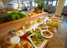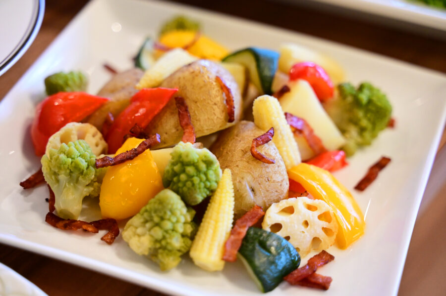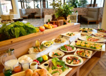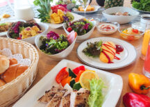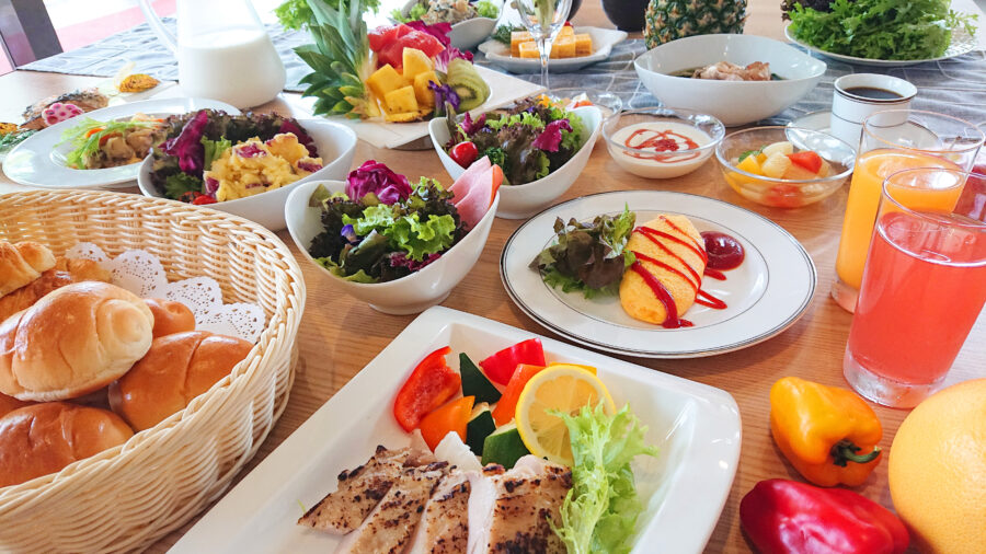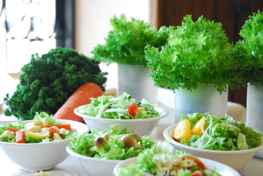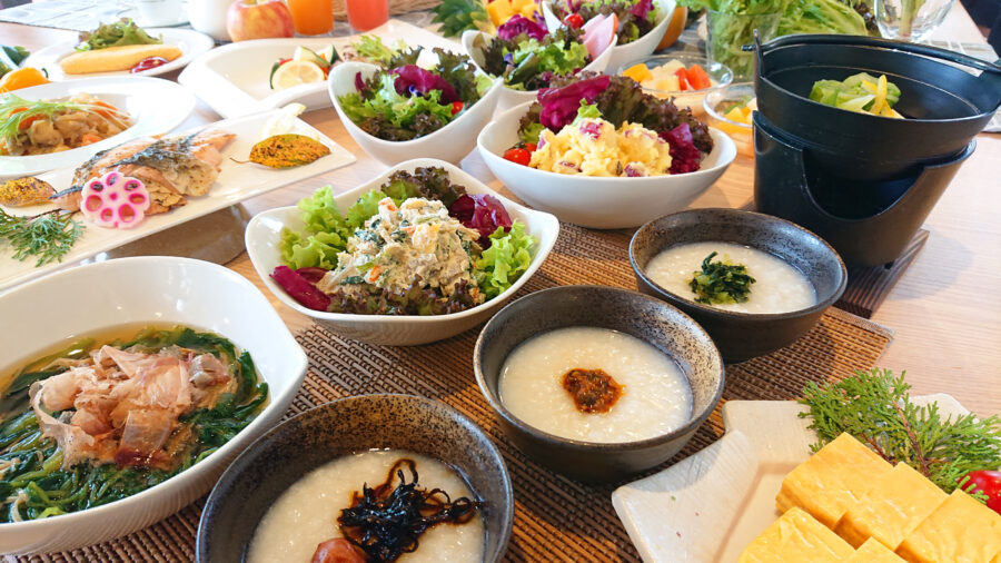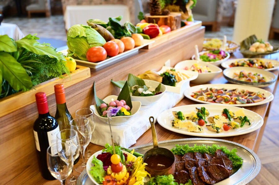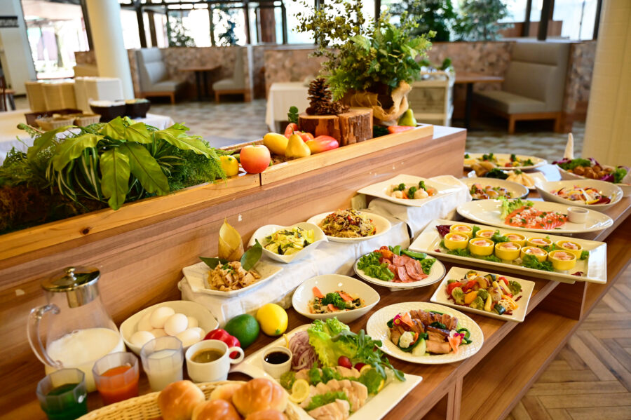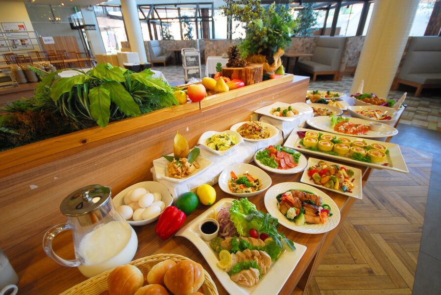 カラダにやさしく元気が出る、その季節ならではの食材や地元で採れた食材を活かしたお料理をバイキング(ブッフェ)スタイルでお楽しみいただけます。自社農園で栽培した野菜をふんだんに使ったメニューです。