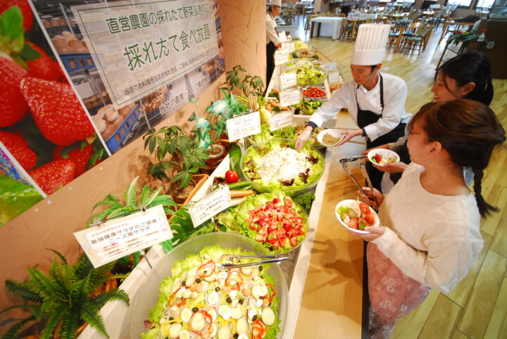 施設内の農園で採れた新鮮野菜を中心としたサラダバイキングコーナーがあります