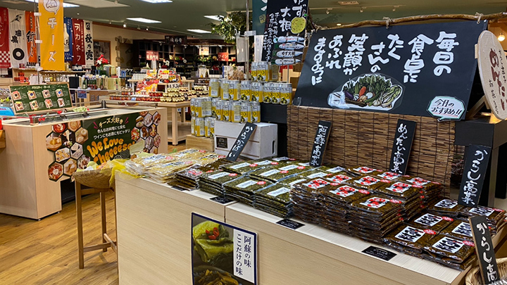 お土産に人気の「濃厚生チーズケーキ1592(ヒゴクニ)」や阿蘇ファームランドの定番スイーツ「カマンベールチーズケーキ」、「あそりんどうプリン」など自家製スイーツはもちろん、その他熊本の特産品などのお土産が充実しています。