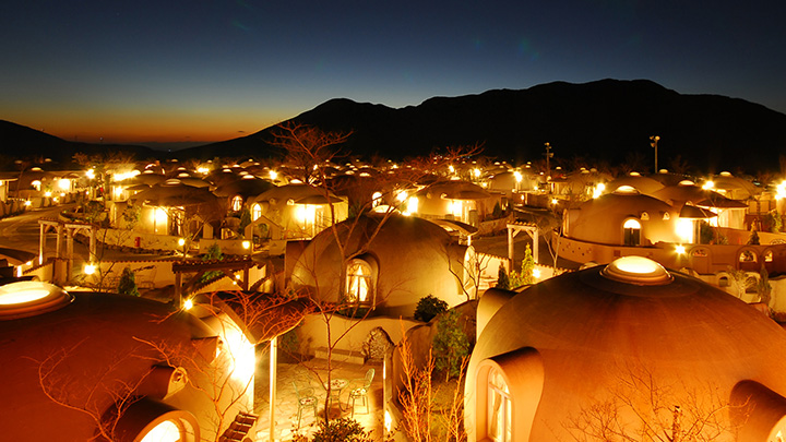 熊本県の阿蘇くじゅう国立公園の雄大な自然に囲まれた絶好のロケーション。自然の地形をそのまま活かした、森の中のドーム型ホテル。300棟以上ありながら、客室がひとつひとつ異なるテイスト。部屋の周囲には木々が茂り、小川が流れ、高原の風が吹き抜けています。