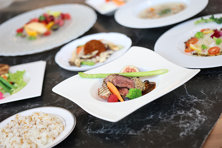 身体にやさしく元気が出る、その季節ならではの食材を活かしたメニューがお召し上がりいただけます。隣接する自社阿蘇健康農園から毎日届く新鮮野菜は、安心安全の無農薬栽培。阿蘇の清涼な伏流水に育てられた野菜をぜひお楽しみください。